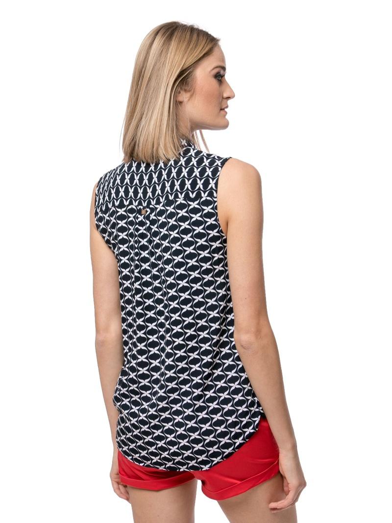 Dámská halenka bez rukávů, ze vzorované látky, s malým kovovým logem.